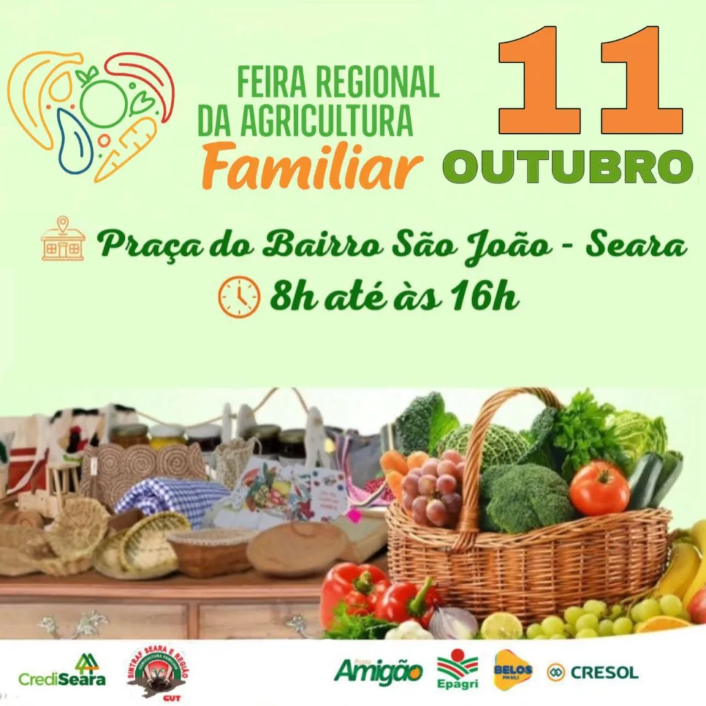 Neste sábado, 11, a Praça Henriqueta Zanuzzo em Seara, receberá mais uma edição da Feira Regional da Agricultura Familiar. O evento será realizado das 8h às 16h e contará com a comercialização de produtos artesanais e da agricultura familiar local e regional.