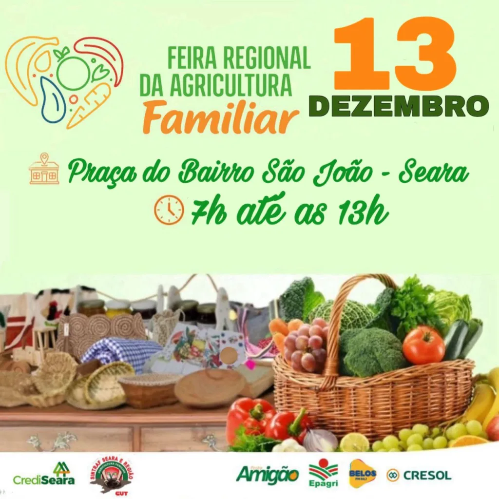 A Feira Regional da Agricultura Familiar acontece neste sábado, 13, das 7h às 13h, na Praça Henriqueta Zanuzzo, em Seara. O evento é tradicional e conta com a comercialização de frutas, verduras, nozes, artesanatos diversos e exclusivos, óleos essenciais, hidrolatos, mudas de flores e chás, geleias, vinhos, mel, panificados, queijos, açúcar mascavo, conservas, farinha de milho, feijão e arroz. Também o Café Colonial, com o pastel e caldo de cana tradicional. É promovido pelo Sintraf e CrediSeara, com apoio da Belos FM, Epagri, Posto Amigão e Cresol.
