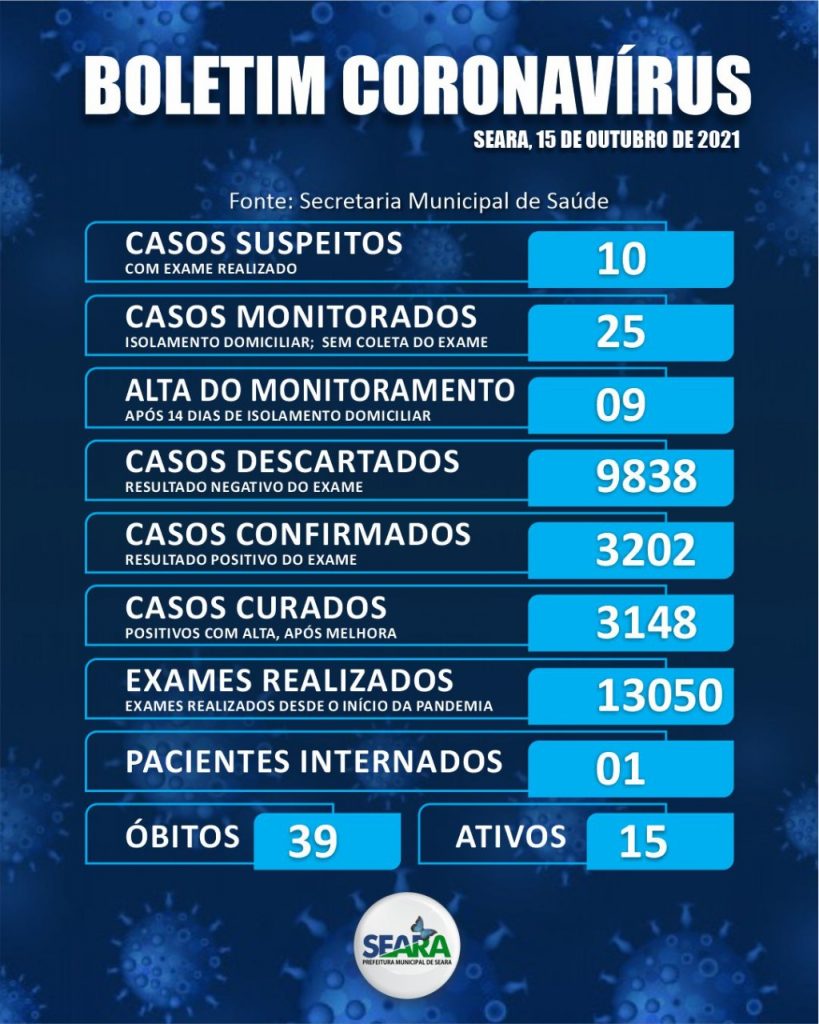 Desde o início da pandemia, 3.202 casos positivos foram registrados e 3.148 pessoas já estão curadas. Seara tem 39 óbitos por complicações da Covid-19. A última morte aconteceu há um mês, no dia 15 de setembro.