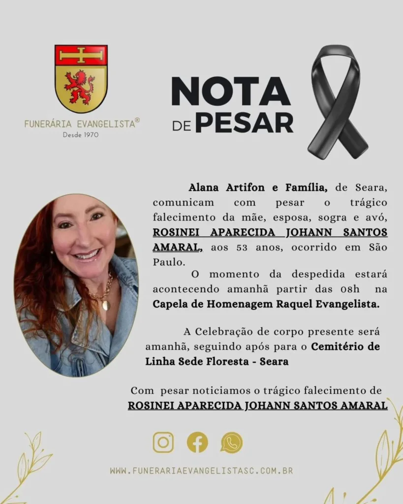 A searaense Rosinei Aparecida Johan Santos Amaral, 53 anos, será sepultada em Seara na manhã desta sexta-feira, 19 de dezembro. O velório será realizado a partir das 8h, na Capela de Homenagens Raquel Evangelista. O corpo de Rosinei será enterrado no cemitério de linha Sede Floresta.