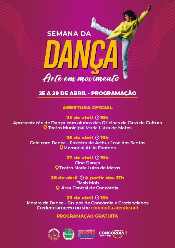 O evento é promovido pela Secretaria de Desporto e Cultura, por meio da Diretoria de Cultura, reunindo os participantes das oficinas de dança, que são mantidas pela Administração Municipal, além de convidados e grupos de dança que poderão se credenciar, gratuitamente, para participar do evento. O link para inscrição está no banner principal do site da Prefeitura de Concórdia (concordia.atende.net).