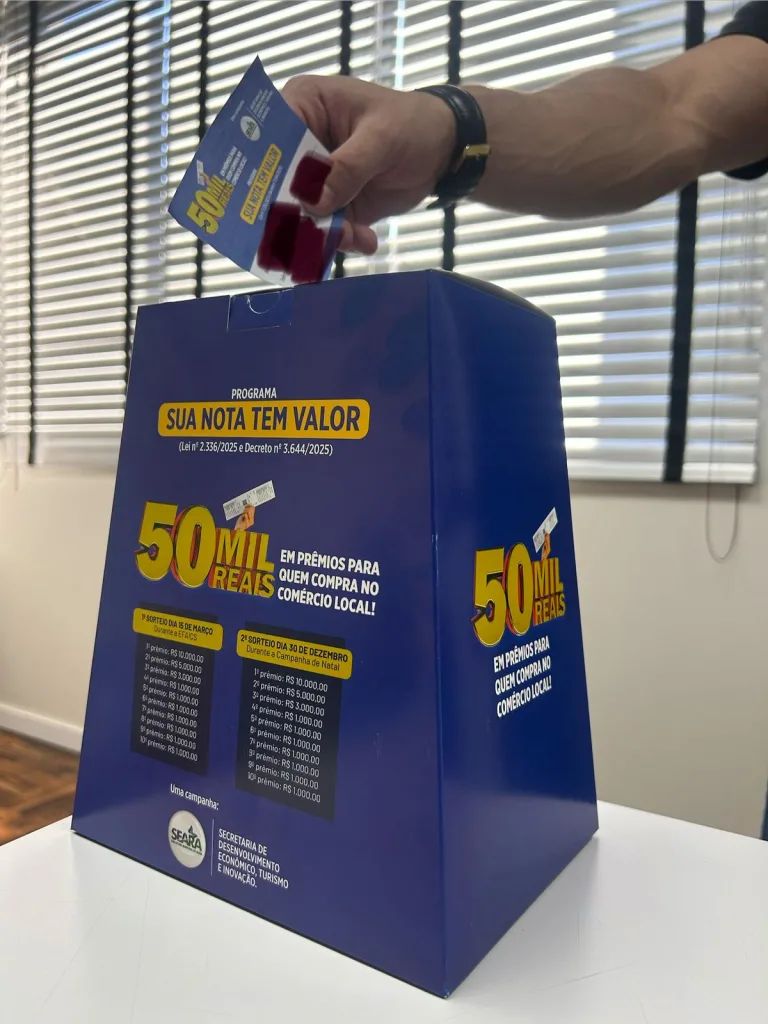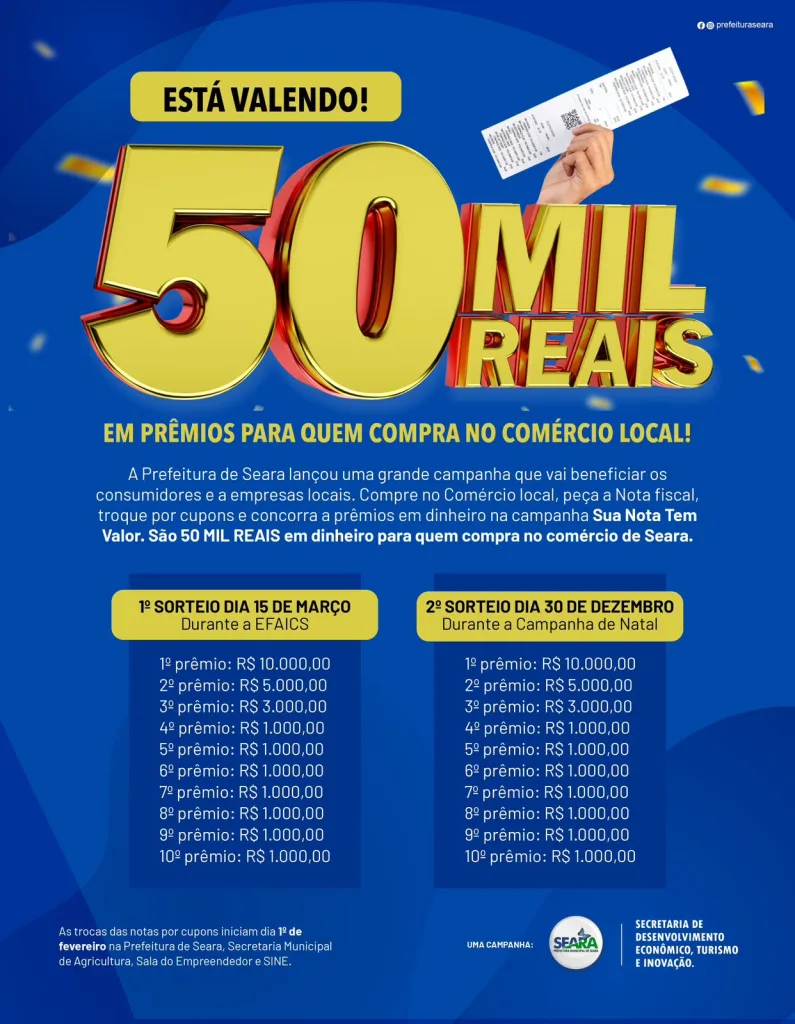 O programa “Sua Nota Tem Valor” já está em andamento e vai distribuir R$ 50 mil em prêmios neste ano de 2026. Conforme a Secretaria de Desenvolvimento Econômico, Turismo e Inovação de Seara, as notas ou cupons fiscais emitidos com data a partir de 1º de janeiro já podem ser trocadas por cupons para concorrer a prêmios em dinheiro.