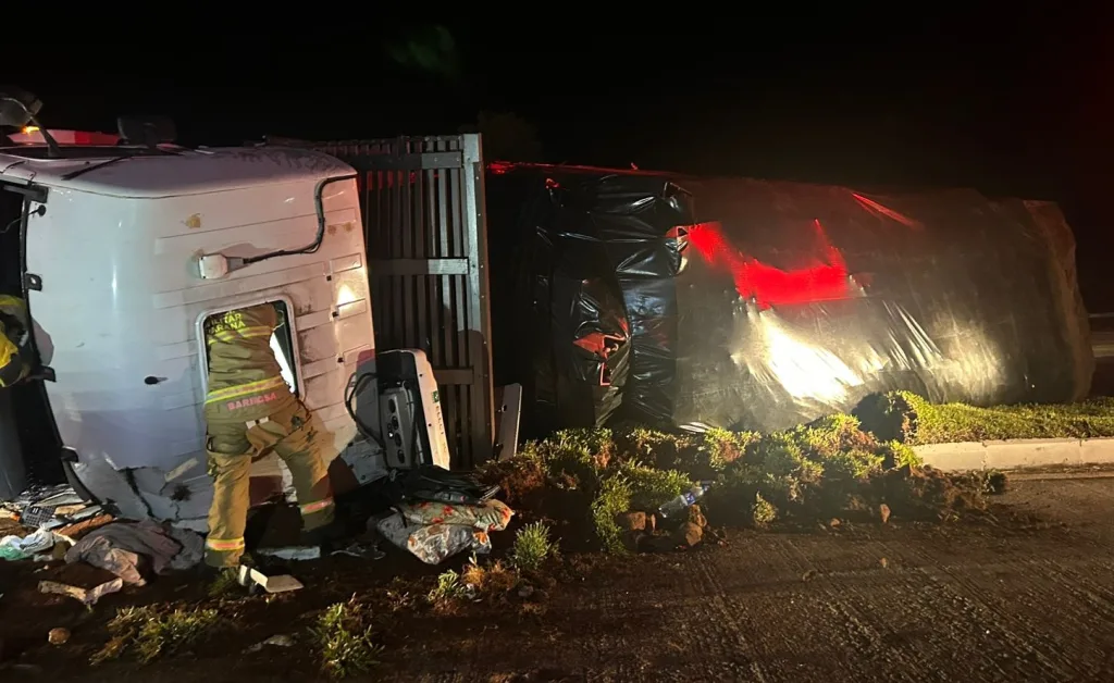 De acordo com as informações do atendimento, um caminhão tombou e ficou lateralizado às margens da rodovia, com dois ocupantes no interior da cabine. As vítimas, dois homens, precisaram de atendimento das equipes de resgate.