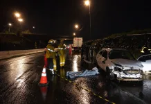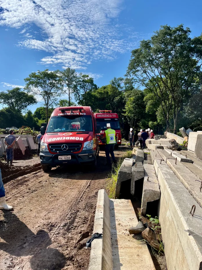 Por volta das 8h50, acionados pelo COBOM de Chapecó, bombeiros se deslocaram para atendimento de ocorrência de acidente de trabalho em uma obra às margens da BR-158, interior de Cunha Porã. Um bloco de concreto pré-moldado de aproximadamente 300 quilos havia caído sobre as pernas de um homem que trabalhava no local. A vítima, de 44 anos, relatava dor intensa na perna esquerda, que presentava suspeita de fratura.