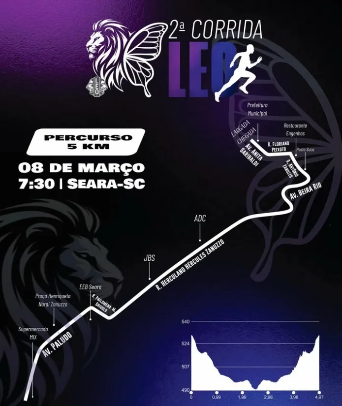 Nesta quarta-feira, 4, é o último dia de inscrições para a 2ª Corrida LEO Clube Seara Centenário, que acontece no domingo, 8. A largada será às 7h30 na Praça Dr. Harry Quadros de Oliveira, no Centro. A concentração e retirada dos kits ocorrerá a partir das 5h30. No sábado, 7, também haverá entrega dos kits das 15h às 18h.