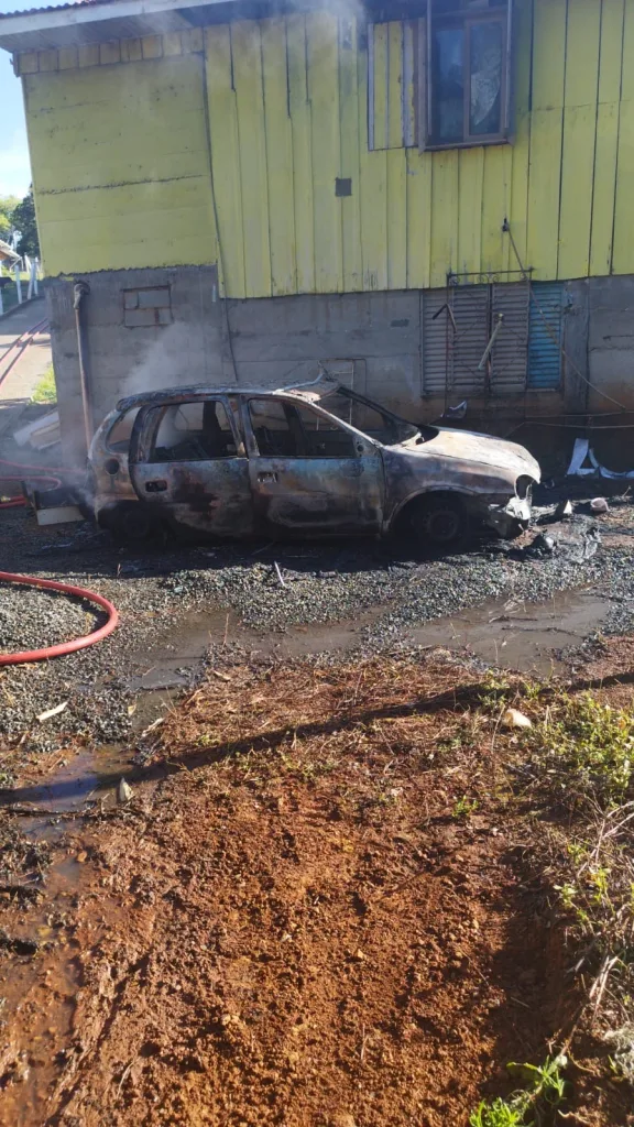 Conforme os Bombeiros, o carro estava estacionado ao lado de uma residência mista (madeira/alvenaria). Ao chegar ao local, a guarnição constatou que o veículo estava totalmente tomado pelas chamas, oferecendo risco iminente de propagação para a edificação.