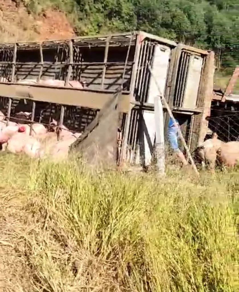 VÍDEO: Caminhão que transportava suínos para Seara tomba no interior de Arabutã