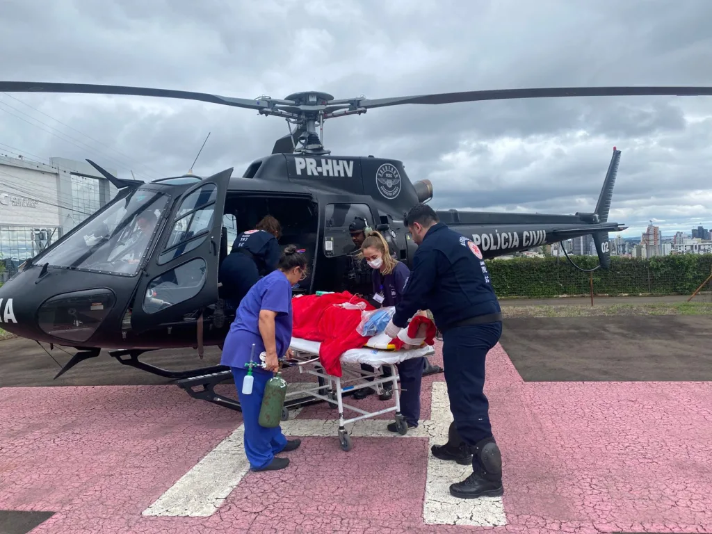A aeronave da Polícia Civil, tripulada por policiais do SAER-Fron e profissionais do SAMU Aeromédico, foi acionada devido a gravidades do caso.