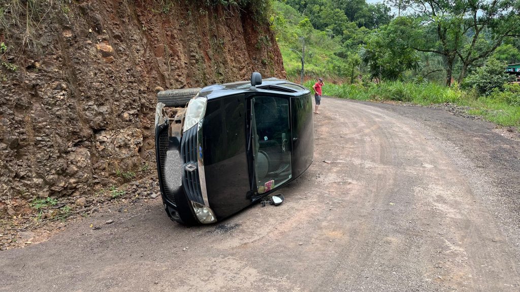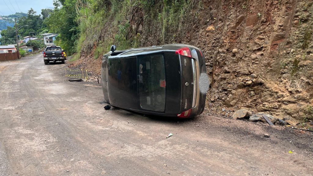 Um veículo Renault Logan ficou lateralizado após acidente na rua Concórdia, no bairro Nossa Senhora Aparecida em Seara. O fato ocorreu no início da tarde desta segunda-feira, 08.
