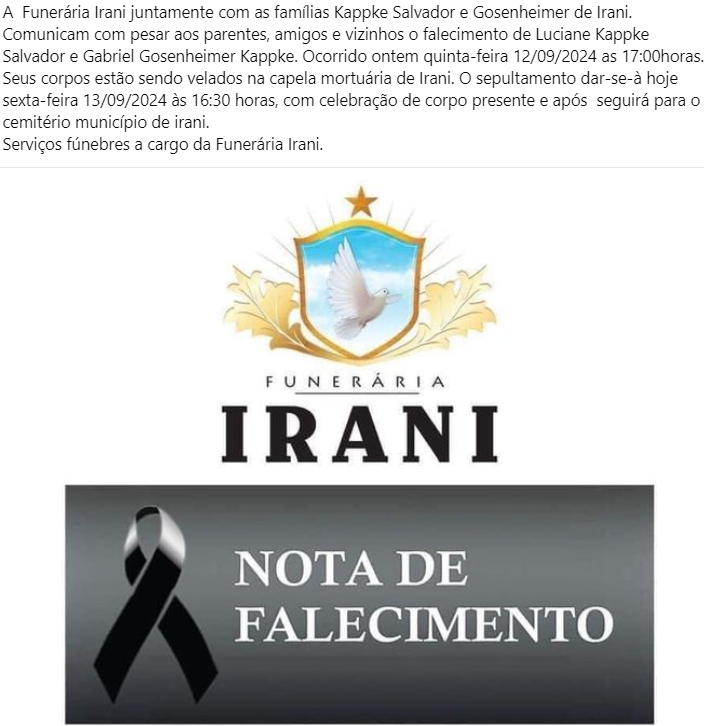 As vítimas fatais do acidente ocorrido na BR-153 em Concórdia serão sepultados nesta sexta-feira, 13, em Irani. Luciane Kappke Salvador e Gabriel Gosenheimer Kappke, tia e sobrinho, estavam na Toyota Hilux/SW4 que ficou destruída após uma colisão contra um caminhão no km 88 da rodovia, na localidade de Barra Seca. O acidente foi registrado às 17h da quinta-feira, 12. (Sublinhado)